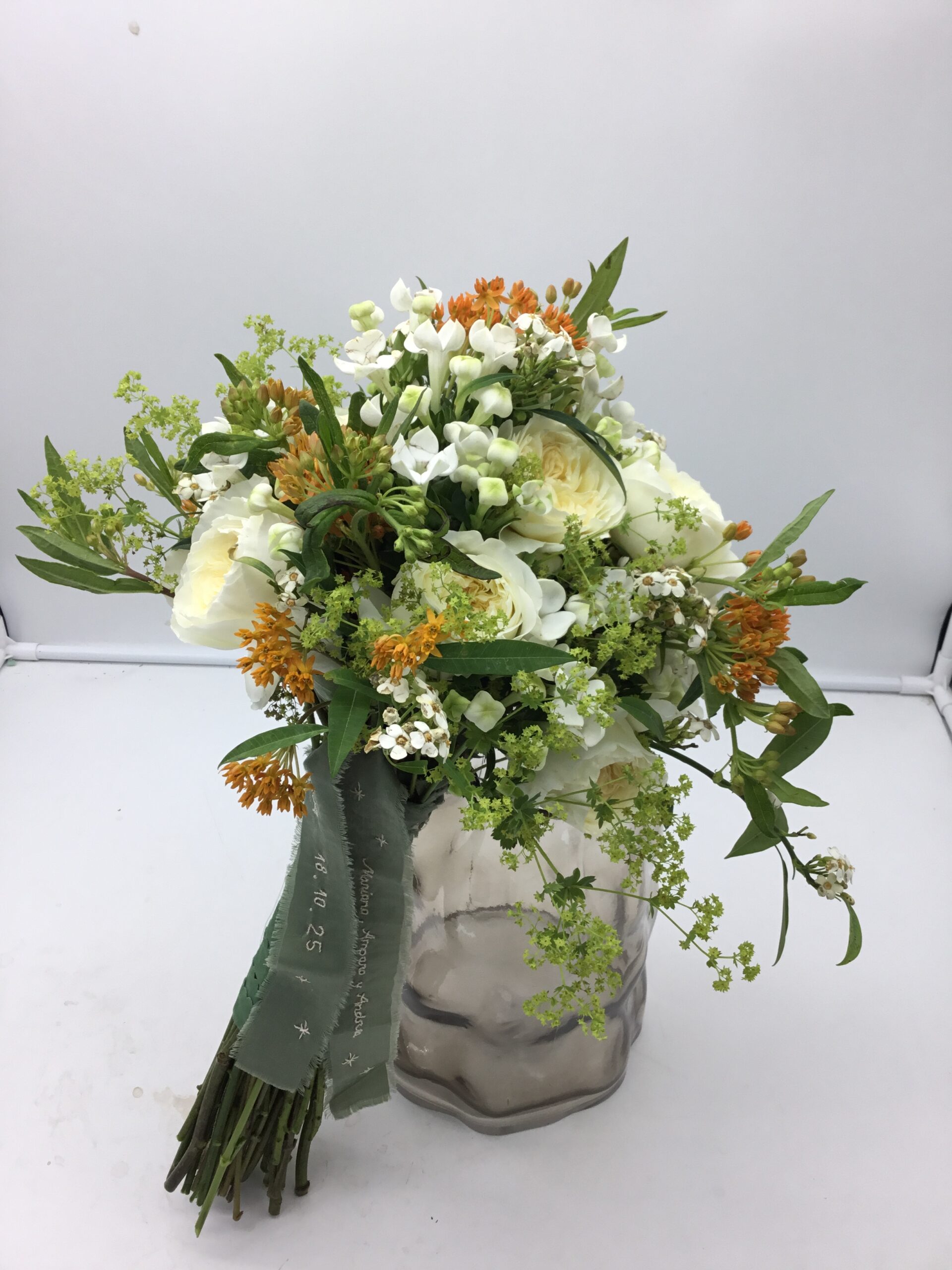 Crema y naranja y verdes para este glamuroso ramo de novia.
